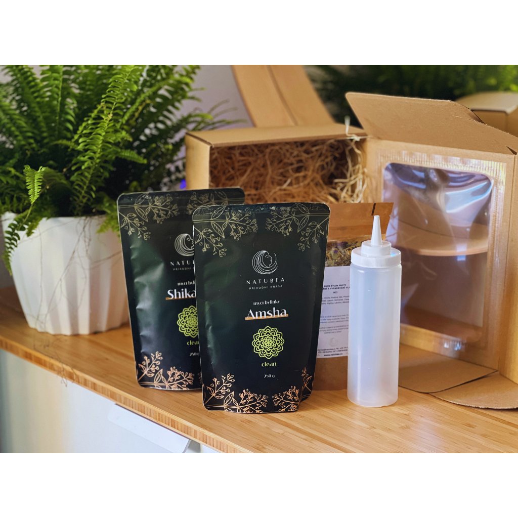 - Obsah balíčku: 2x ajurvédské byliny od NATUBEA 100 g (Amsha, Reetha), 1x směs bylin na oplach 50 g Rovnováha, 1× aplikační lahvička.