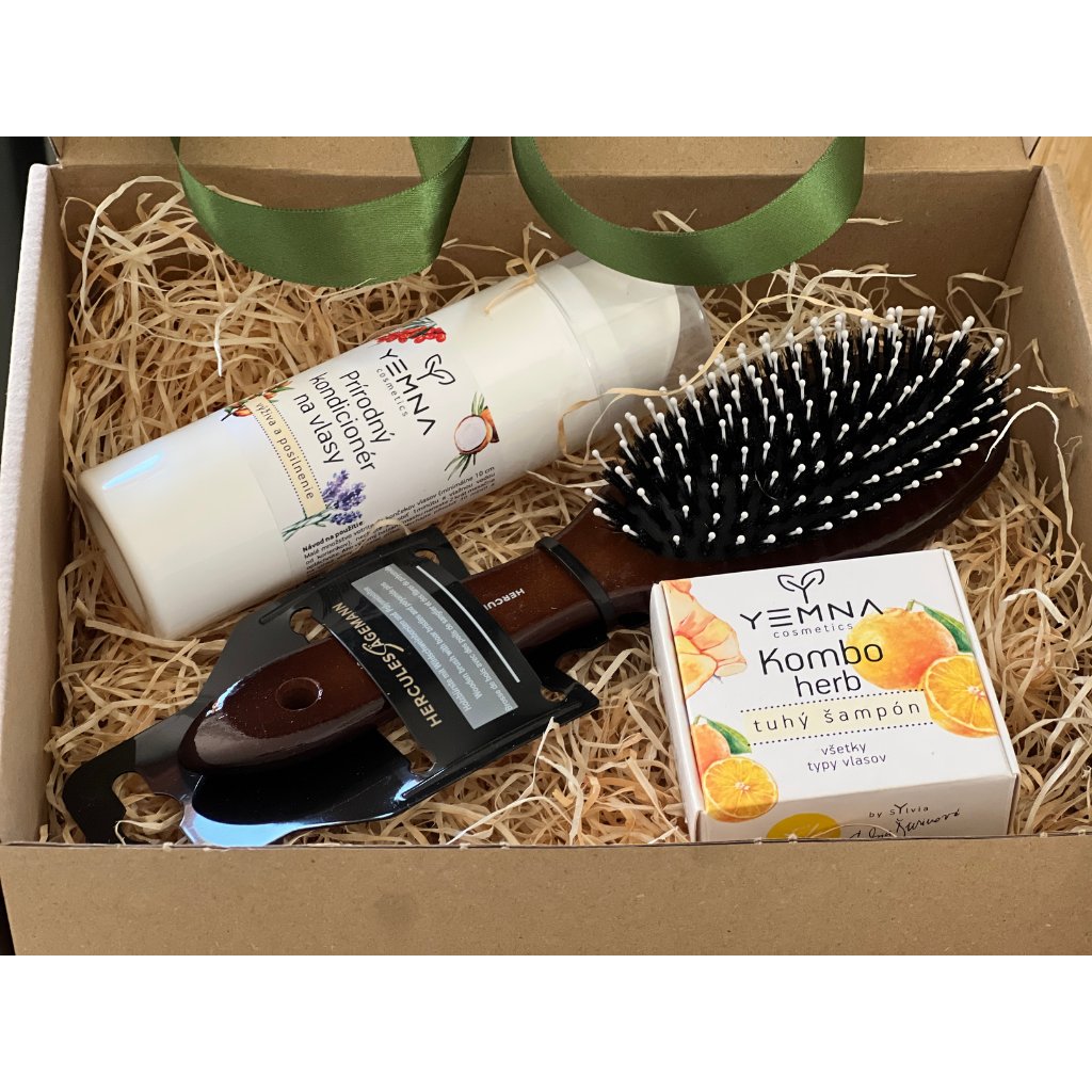 - Obsah balíčku: tuhý šampon Yemna Kombo Herb 55 g, kondicionér Yemna 150 ml, kartáč Hercules 9045 (tmavý, velikost L).