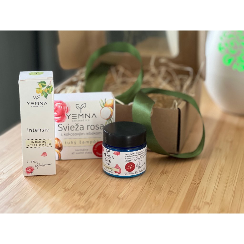 Dárkový balíček Yemna – Pleť mini spojuje hydratační oční gel INTENSIV, krémový deodorant Svěží rosa a tuhý šampon se svěží bylinnou vůní. Jemná přírodní péče, která rozjasňuje pleť a podporuje harmonii celého těla. 🌺