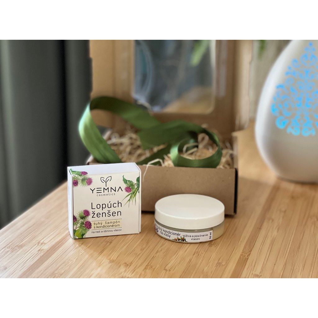 - Obsah balíčku: tuhý šampon Yemna Lopuch & ženšen 55 g, kondicionér Yemna 50 ml.